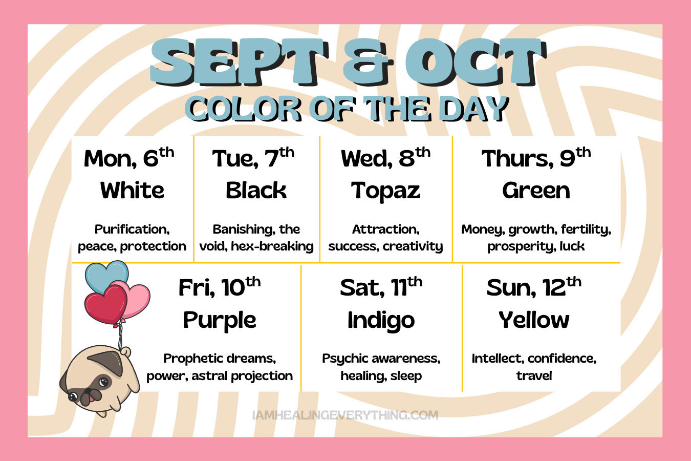 Each day carries its own frequency and colors act like amplifiers for that energy. Wearing, carrying, or surrounding yourself with the day’s color helps you align more fully with its vibe. Think of it as dressing in sync with the universe!